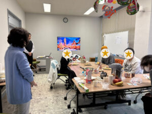 参加者3名+職員で開催しました。 クリスマス音楽を流し「楽しいアニメのミニ上映会」や「輪投げゲーム大会」 そしてみんなで作る「オリジナルホットケーキ」懐かしい音楽やお気に入りの曲を聴きながらワイワイとおしゃべりしながら楽しい時間を過ごしました。さらに素敵な歌声もいただき大変盛り上がりました。